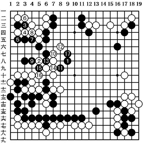 黑17的时候,白2的断非常严厉,以下行至白12黑棋的气非常紧,左边的黑棋一下子就麻烦了。