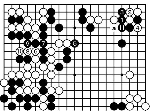 好戏就此开始。黑21从技术层面来看错过了机会。这个时候应该从黑1和黑3直接动手比较好。如果此时白棋选择11位断的话,黑a开始断之后就能保证各种借用。黑3之后白4稳健活棋,如果就此能赢棋就算了,但是黑5之后白6到白10需要活棋。然后黑11之后黑棋的实空就非常大,所以说白棋不能选择这个变化。