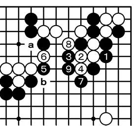 此时选择黑1到黑3会如何呢?此时白4后有黑5扳的手段。此时白6挖的好手,黑7开始滚包,不过此时黑棋也没有办法,因为a和b形成见合。