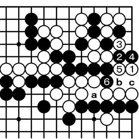 此时教科书般的正解的白1,但是此时黑2和黑4的抵抗就成立。白5之后黑6挤,白棋非常麻烦,白a之后黑b的话就没有还手机会。又因为气紧没法在c位粘上。