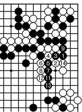 研究室此时认为,黑53的时候选择黑1是最后的抵抗手段,但是白2的小尖是好手,这样一来白棋可以在局部撑住。黑3和黑5之后,白6行至黑13形成交换,最好白14紧气,这样对杀是白棋胜。