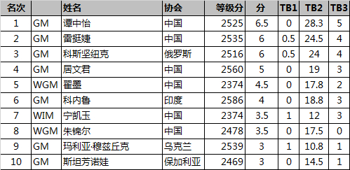 12月11日下午,进入下半程对决,谭中怡逐渐找回状态4轮比赛收获3胜1和的佳绩,其中在第7轮榜首对冲战中谭中怡执白战胜科斯坚纽克,凭借着稳健的发挥最终谭中怡以5胜3和1负积6.5分的战绩夺得冠军。雷挺婕在第二个比赛日中收获1胜3和的战绩,9轮结束雷挺婕与俄罗斯名将科斯坚纽克同积6分,经过比对小分,雷挺婕以微弱优势锁定亚军,科斯坚纽克获得季军。
