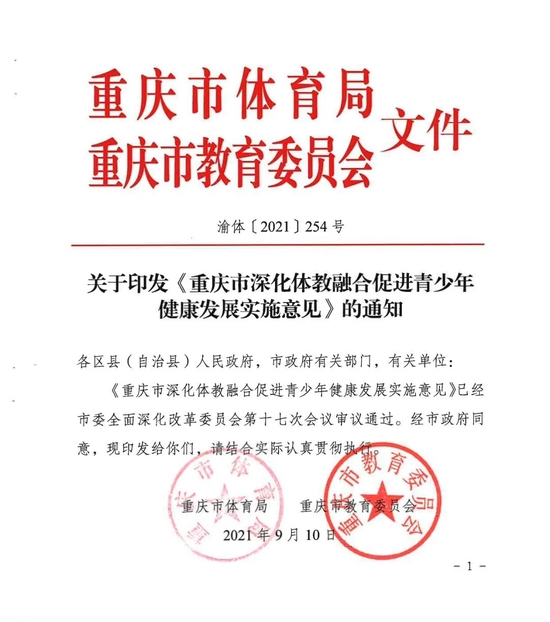 9月26日,重庆市体育局、重庆市教育委员会正式印发《重庆市深化体教融合促进青少年健康发展实施意见》。