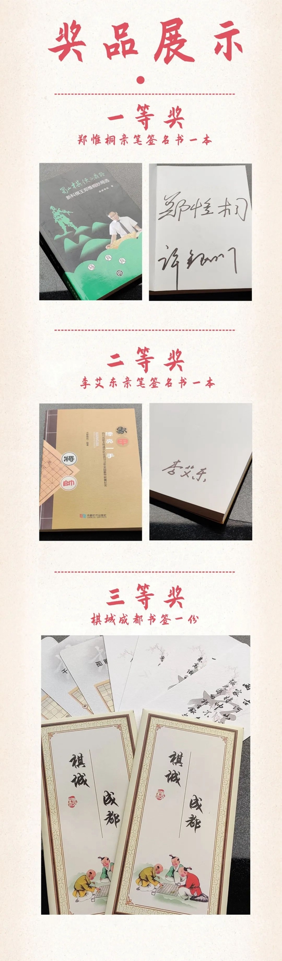 只要你喜爱棋类运动,关注“棋城”的发展,关注成都日报微信公众号,转发本条“棋城·新棋王”系列报道到朋友圈集赞并截图,可私信给小编道出你与“棋城”的故事,写出你对“棋城”的期许,就将有机会获得由成都棋院专门为棋迷提供的有棋王签名的棋书以及书签等奖品。