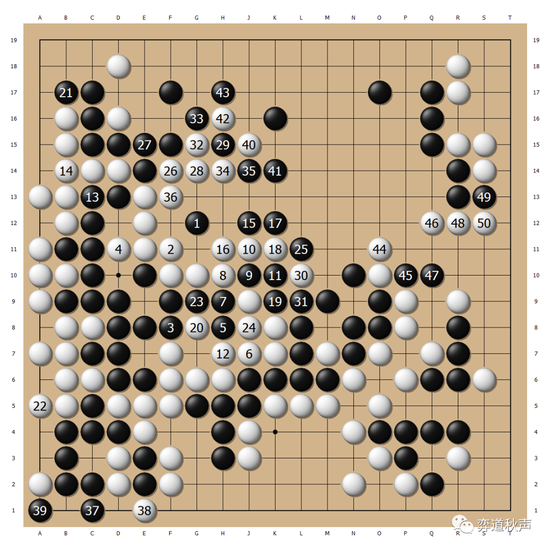 白28、30又在右边腾挪,柯洁下得过于潇洒了。黑31冷静,白棋有点自寻烦恼。