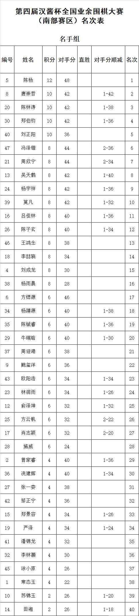 1月16日,第四届“汉酱杯”全国业余围棋大赛南部赛区的前四、五、六轮比赛在广州三寓宾馆战罢,名手组中陈杨6轮全胜领跑积分榜,唐崇哲、郑伯钧、刘正阳、陈霖涛积10分紧随其后。