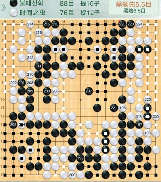 对黑棋的一番攻击下来,白棋就吃了干巴巴的三个子,代价是被黑棋侵入右路,中原的成空潜能也消除于无形。自己下面还要后手补活(200手是后手),当201黑棋先手侵入左路后,大申一路顺风拿下比赛。