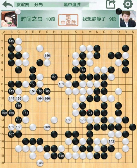 下到144手,形成了白棋相当有利的局面。焦点在于白棋如何攻击黑棋下面一团浮子,这是杨鼎新需要把握的。但面对力量并不出色的大申,杨鼎新再度出现了手软。