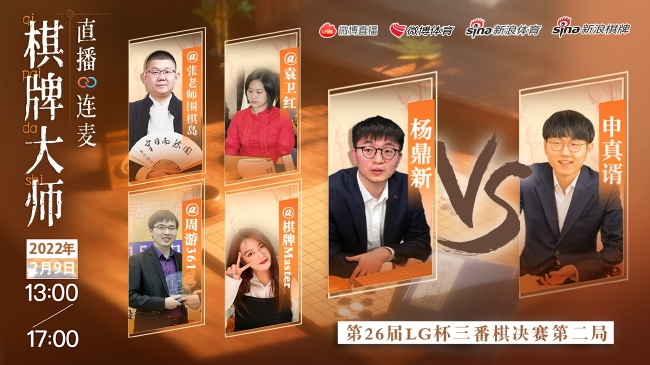 2月9日,第26届LG杯世界棋王赛决赛次局在线上续战,熟悉杨鼎新等棋手成长经历的职业棋手@袁卫红、 围棋岛创始人张杰老师@张老师围棋岛 、新浪棋牌主编周游@周游361、业余围棋高手苏州九星围棋CEO刘月明@劉月明w四位嘉宾进行线上连麦直播。最终在今天的比赛中杨鼎新再次遗憾告负,申真谞捧得奖杯。比赛结束后四位嘉宾老师谈及本次观赛的感受,都难掩惋惜之情,但也都表示,申真谞并不可怕,也并非碾压取胜,在世赛众多的2022年,中国棋手仍有很多机会。