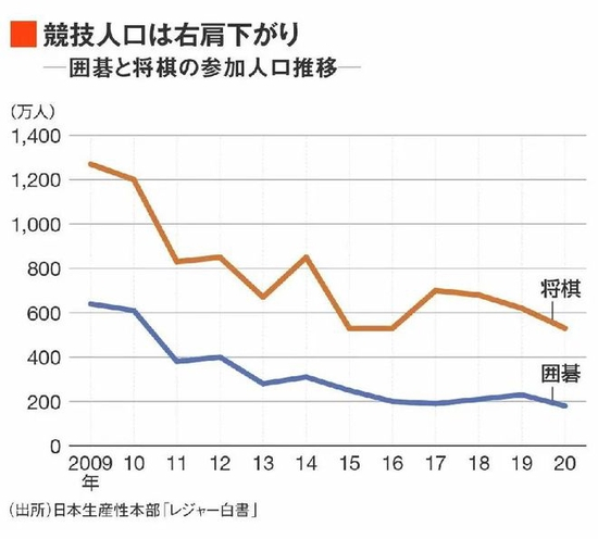 围棋也同样如此,2009年还是640万人,到了2020年降到了180万人,降幅有70%左右。随着日本围棋棋迷的高龄化,有围棋职业棋手表示:“日本棋院为首的组织并没有深入进行围棋普及”。