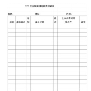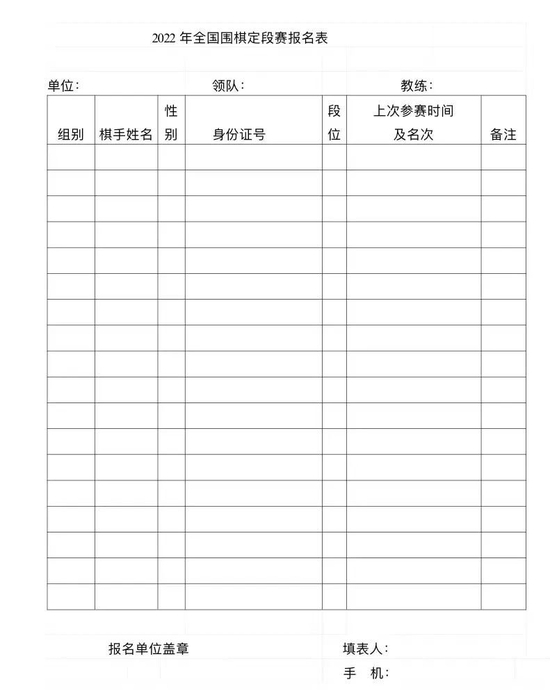 重点提示:各参赛队请务必将报名表电子版分为两个附件发送,一为原始WORD文档、一为盖红章后扫描的PDF版本或拍照的图片版本。电子邮件发送主题和附件文件名均为:“×××队_2022年全国围棋定段赛报名表”。
