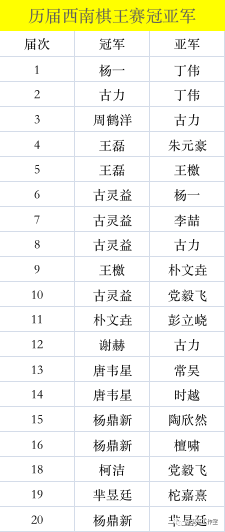 今年的具体参赛名单还未公布;不过西南王每年的参赛阵容都不会令人“失望”。注册在云南队的柯洁、重庆的杨鼎新李轩豪、四川的党毅飞廖元赫等等中国顶尖选手不出意外会继续参赛。