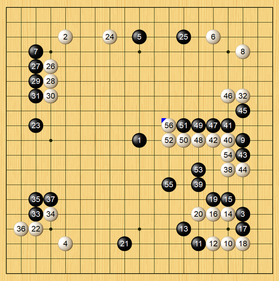 围棋史家评论,本局下到白56拐头时,黑1天元一子效力被严重消减,遂成败局。而在人工智能绝艺看来,黑53是跌了40个胜率点的恶手,不过到白56时,黑棋仍有34%的胜率,局势尚早。