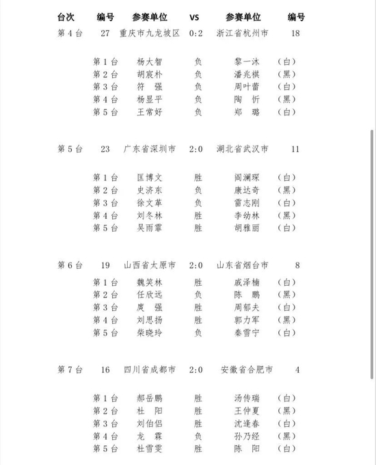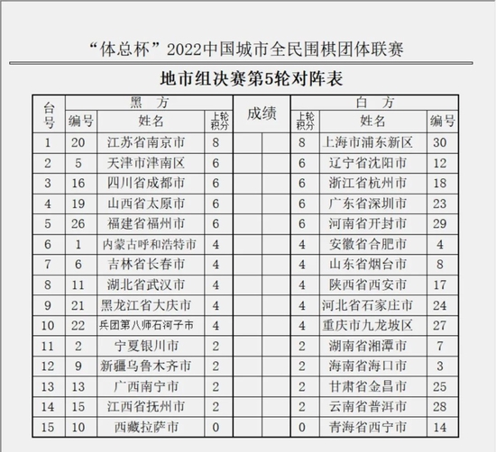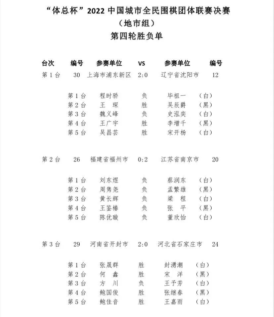 6月16日,“体总杯”2022中国城市全民围棋团体联赛地市组决赛第四轮结束。江苏省南京市队、上海市浦东新区队取得四连胜积8分,领跑积分榜;另外有8支队伍3胜1负积6分,紧随其后。明天将开始第五轮比赛。