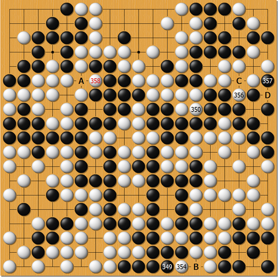 实战,白棋第358手落子后的局面,与第350手后的局面相同,因此白方常昊率先触发全局同形,犯规。