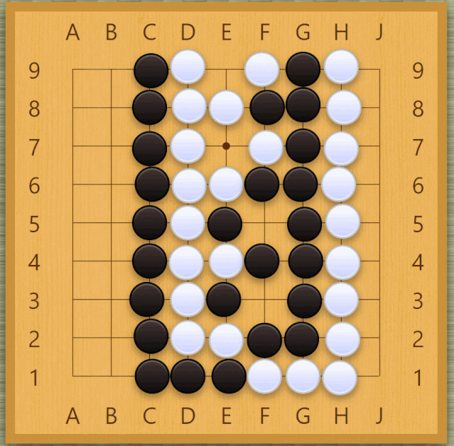 比如现在轮到黑棋下,在日本、韩国规则下,棋局会像下图这样发展。