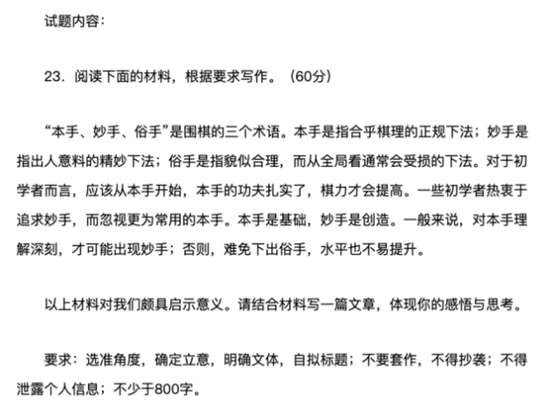 中国围棋协会主席林建超的著作《围棋与国家》中的片段,曾经在2012年进入山东省高考语文试卷,我至今记忆犹新。而“围棋人机大战”早在2016年5月就成为湖南省高三百校联考的作文材料。一段时间以来,经过各级领导以及众多文件的广泛使用,又加上媒体的宣传跟进,“收官”“先手”“读秒”等围棋术语,早已广为流传,使用时基本上用不着加以特别注释了。尽管如此,这次直接将围棋术语作为高考作文素材,而且在多达山东、福建、湖北、江苏、广东、湖南、河北等七个省的高考中使用。必须强调这是掀开了教育史、高考史和围棋史的划时代篇章,具有里程碑意义。