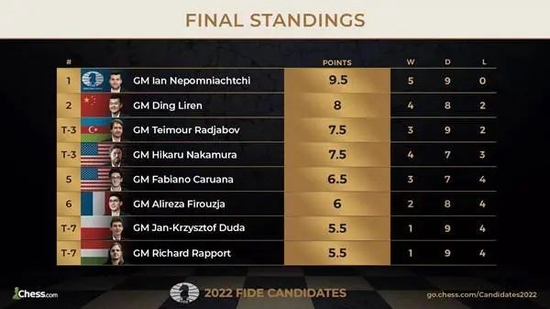 北京时间今天凌晨,2022国际棋联世界冠军候选人赛在西班牙马德里结束,俄罗斯棋手涅波姆尼亚奇以9.5分获得冠军。中国棋手丁立人在末轮取胜,最终以4胜8和2负积8分的成绩排名第二。这是他三次参赛成绩最好的一次,同时也是中国男棋手向个人世界冠军顶峰冲击的历程中,取得的历史最佳成绩。