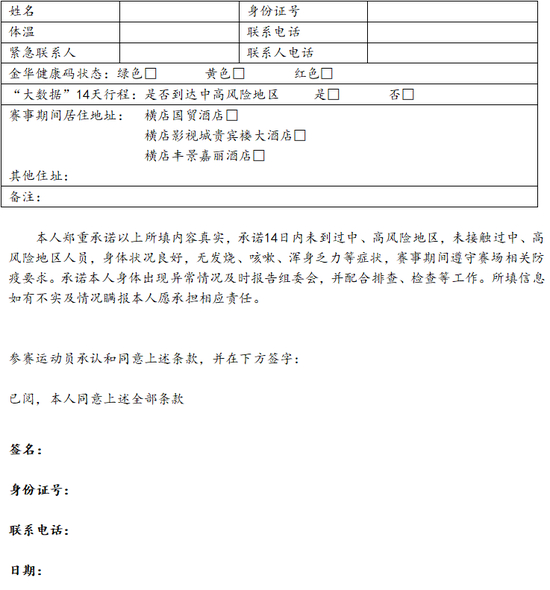 2。 参赛运动员在报到处填写运动员参赛声明以及防控疫情承诺书。进入比赛区域后须时刻正确佩戴口罩、勤洗手(赛事组委会将会在比赛现场提供充足的口罩、免洗消毒液等防疫物品);