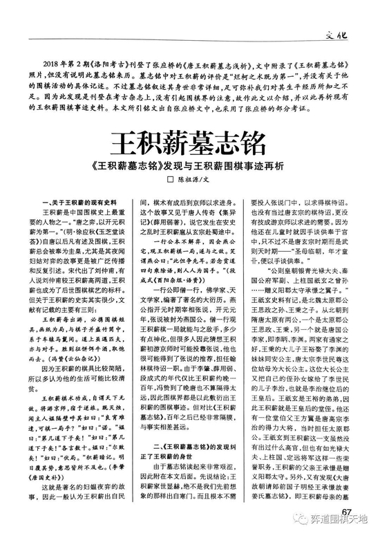 王积薪是中国围棋史上最重要的人物之一。明徐应秋《玉芝堂谈荟》曰:“唐之弈,以开元积薪为第一。”本文将对王积薪墓志铭试做浅探。