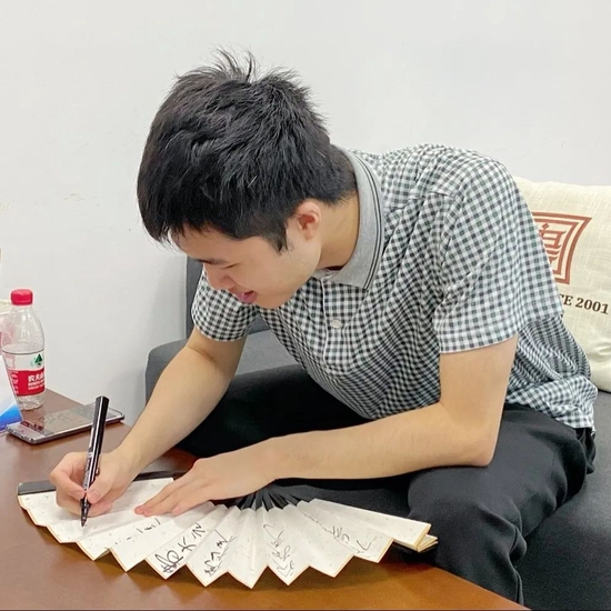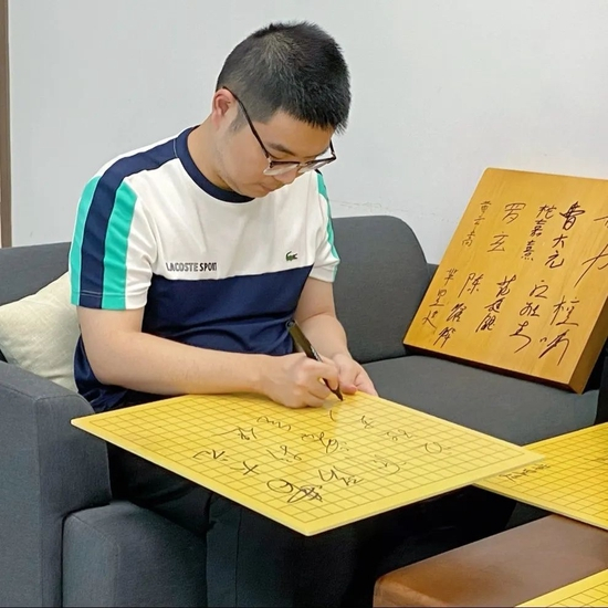 虽然是客队棋手的比赛,虽然只有一台棋,但山东人民的热情好客不打折扣,尤其齐鲁棋院还运营着有围甲老牌强队之称的山海大象队,自然明白本次比赛的重要性。棋院老师们贴心地准备好了两位棋手的姓名签,备好茶水与果盘,为两位棋手创造了良好的比赛环境。上午十点左右,比赛正式开始,经过五个小时的激烈对决,芈昱廷执黑中盘胜出。比赛圆满结束,两位棋手特意为棋院留下了签名折扇,用自己的方式表达感谢。