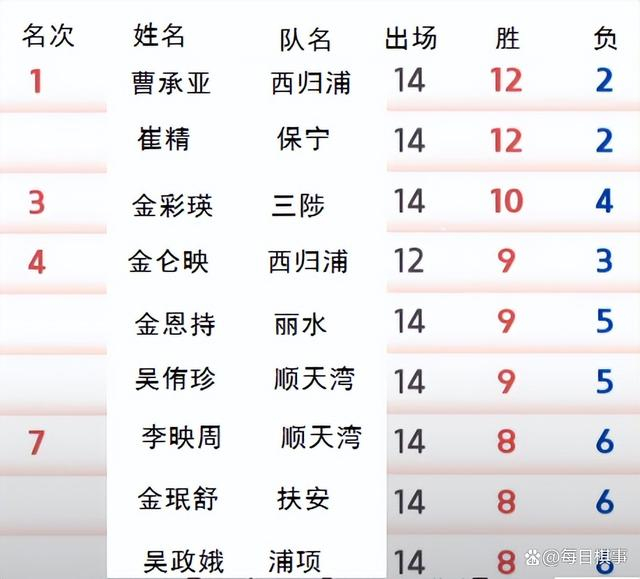 季后赛将于9.14开始,首场由扶安对阵卫冕冠军三陟。本赛季韩女联个人胜局榜——
