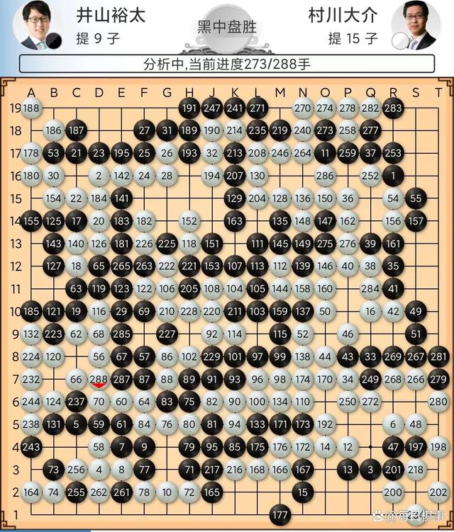 第47期棋圣战循环圈S组9.1进行了第4轮最后一场比赛,井山裕太执黑胜村川大介,在芝野虎丸四连胜锁定第一的情况下,井山,许家元,高尾绅路三个2胜2负,将在最后一轮为了争夺S组第2展开最后冲刺。