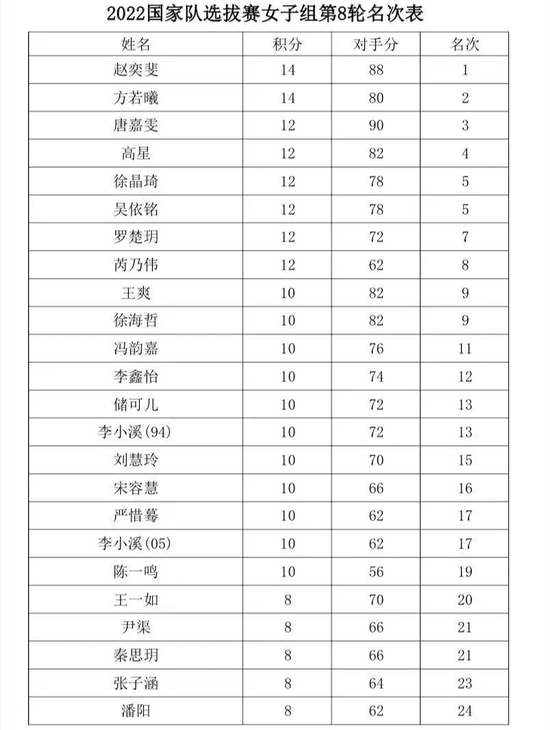 根据此次国家队选拔赛规定,各组前3名可入选国家队,其他人选将根据本次选拔赛名次和其他赛事表现、年龄等因素确定。