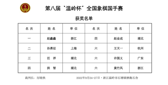赵鑫鑫胜出,拿下本届比赛的总冠军,这是他继2018年之后,时隔四年,家门口出战,再次夺得国手赛的桂冠,孙勇征取得亚军,汪yang季军,洪智、赵金成并列殿军,王天一、许国义、黄竹风并列第六,2022年第八届“温岭杯”全国象棋国手赛圆满成功。