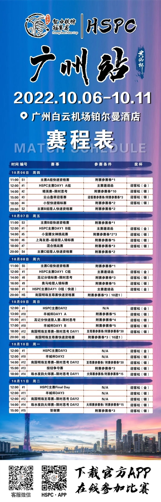 主赛事Day4将在10月11日中午12点开赛,羊城杯Day3和南国明珠至尊赛-限时思考Day2同样在中午12点开赛。珠水夜韵大师赛-限时思考Day2将在下午14点开赛,本次黄山杯广州站的最后一场附赛-答谢赛将在下午15点开赛。