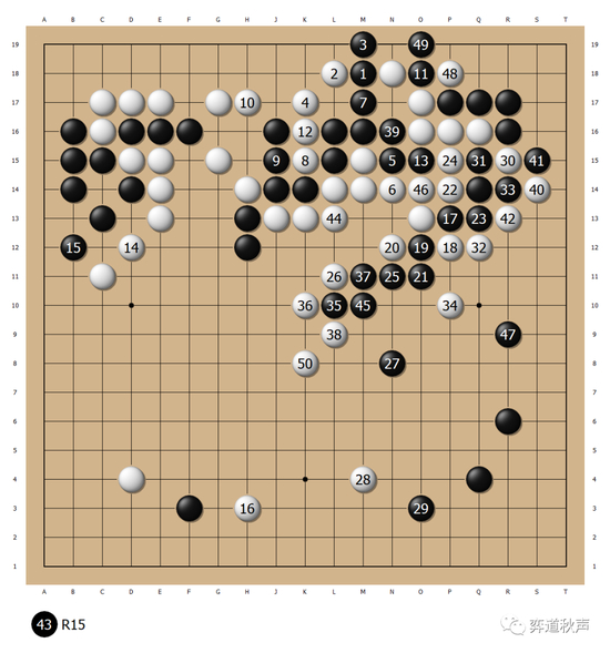 双方都是几块棋不活的样子,白40尖时,黑41不肯吃掉中腹白棋转换,范廷钰在关键时刻更加狠辣。