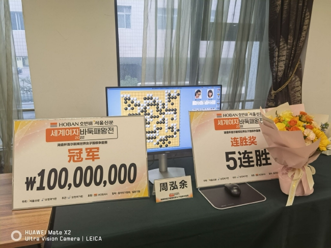 10月20日,2022首届湖盘杯首尔新闻世界女子围棋争霸赛第13局战罢,中国副将周泓余中盘击败日本主将上野爱咲美,终结了比赛,中国队夺得本次比赛冠军,并获得1亿韩元冠军奖金。三国女子围棋擂台赛历经正官庄杯、黄龙士杯、湖盘杯共计16届赛事,中韩各夺8次冠军暂时平分秋色。
