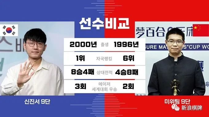 芈昱廷申真谞两位选手至今交手了12次,申真谞以8胜4负领先。最近一次的对决是今年国手山脉杯16强,小申获胜。此外有一个有趣的记录,在以中国规则(7目半)的8次对决中申真谞取得4胜4负,而在以韩国规则(6目半)的4次对决中,申真谞4战全胜。