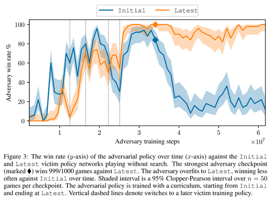 研究者还评估了对 Latest 的最佳对抗策略检查点,取得了超过 99% 的胜率。并且,如此高的胜率是在对抗策略仅训练 3.4 × 10^7 个时间步长的情况下实现的,这一数据是受害者时间步长的 0.3%。