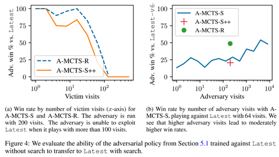 研究者将对抗策略成功地迁移到了低搜索机制上,并评估了上一节训练的对抗策略对有搜索 Latest 的能力。如下图 4a 所示,他们发现在 32 个受害者回合时,A-MCTS-S 对受害者的胜率下降到了 80%。但这里,受害者在训练与推理时都没有搜索。