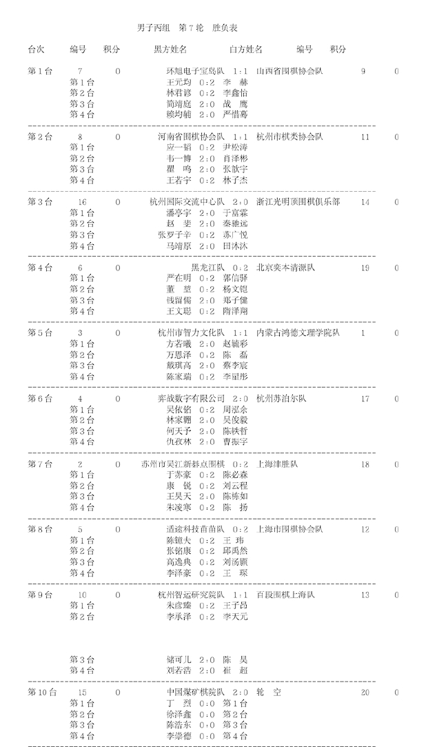 男子丙组也在今日进行了最终轮的比拼,此前同积10分的环旭电子宝岛与杭州市棋类协会队本轮纷纷与对手打平取得1分,但也是这宝贵的1分帮助他们成功保住了自己的前两位成功升入乙级;杭州国际交流中心3-1战胜了浙江光明顶围棋俱乐部拿到2分,最终以10积分位列第3,获得了最后一个升级名额。