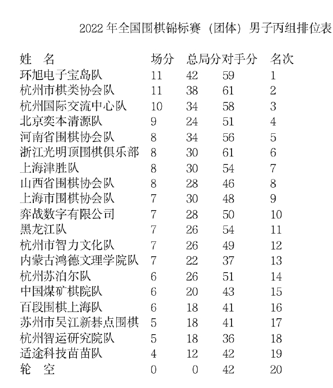 11月22日,华锐教育杯全国围棋团体赛第7轮在江苏无锡中威蓝海御华酒店战罢。女子乙组广东水浒文化与成都棋院队在最终排名中位列前2,成功升入甲级联赛;男子丙组,环旭电子宝岛队、杭州市棋类协会队、杭州国际交流中心队三队升入乙组。