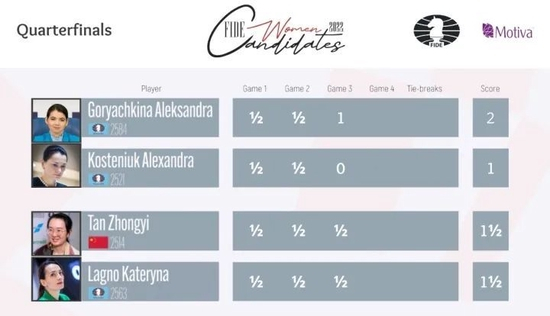 今天18:00将展开第四轮的争斗。谭中怡和拉戈诺仍然是平分秋色的状态,如果两人继续打平,就会在明天进入快棋加赛,胜者与戈尔亚奇金娜争夺出线资格。