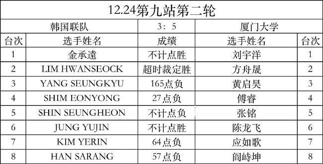12月24日,第七届世界大学生围棋联谊赛第9站比赛进行,厦门大学与韩国联队在弈客比赛平台隔空对决,最终厦门大学以两轮总分11比5获得优胜。