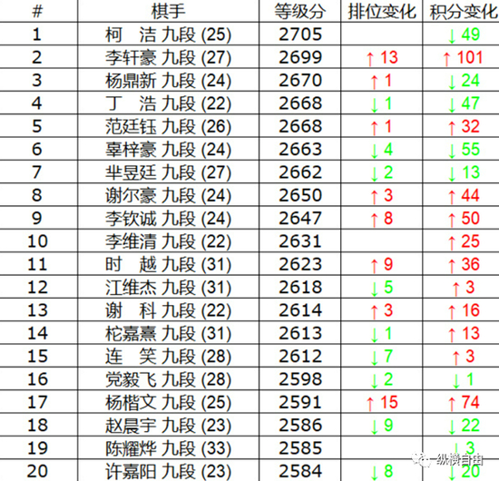柯洁依然排在第一位,可是等级分下降49分,与第二名的分差从上年度的36分缩小到6分。李轩豪排在第二,上升13位。前十名中有两位00后小将,分别是第四位的丁浩和第十位的李维清。