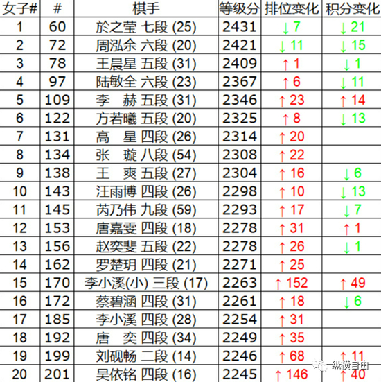 2、女子排名第一的於之莹等级分四战全败,无一胜局