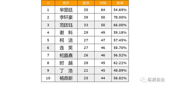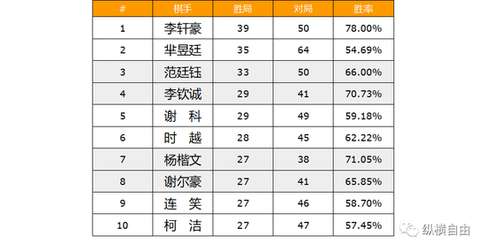 如果计算非等级分对局,王星昊以50胜19负排在胜局榜第一,李轩豪44胜15负排在第二,吴依铭44胜24负排在第三。