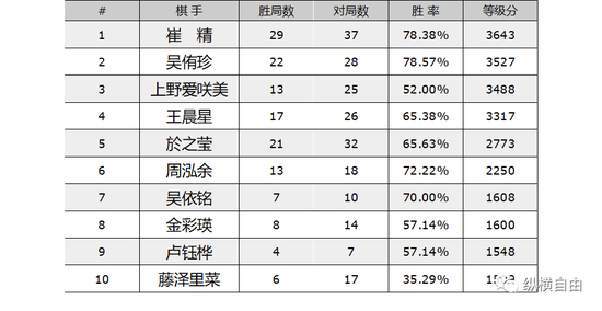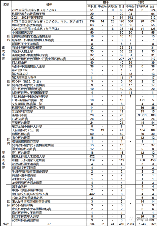 非等级分比赛中,国家队选拔赛以456局最多,其次是天台山女子围棋公开赛,共计184局。国家队衢州训练赛十轮刚好100局,可惜第十轮的比赛成绩没能录入。