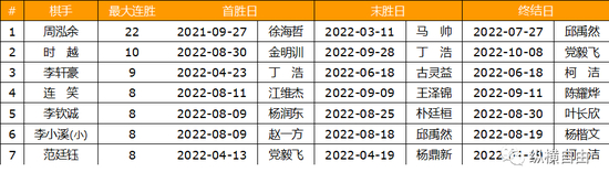 周泓余实现跨年度22连胜,仅距离史上最大等级分连胜纪录23局一局之遥。时越、李轩豪分别实现年度十连胜和九连胜。另外有12名棋手获得最大七连胜的成绩。