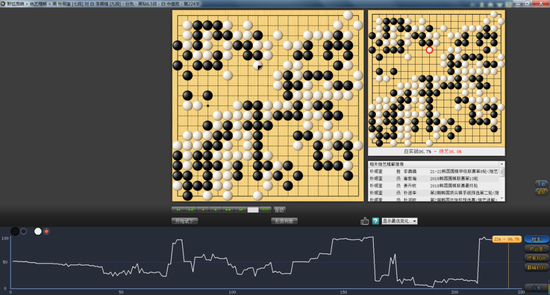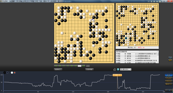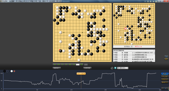然而,打劫过程中,处于读秒中的李昌镐还是出现了失误,找了一个几乎是不痛不痒的劫材,仅仅于右上吃住黑四子而浅尝辄止,致胜率暴跌80多个百分点。朴珉奎消劫后,局面顿时峰回路转,柳暗花明,一片大好。