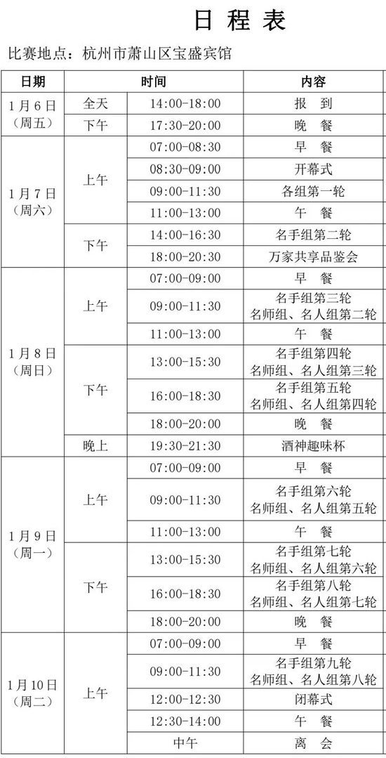 本届比赛受疫情影响,计划中的四站分站赛只举行了南宁站、天津站、无锡站。7日-10日,三站分站赛成绩优异者齐聚萧山,将决出总冠军。名手组共9轮比赛,名师组和名人组各8轮比赛,全部比赛将在10日上午结束。7日,名手组赛罢两轮,陈扬、潘文君、王琛、马天放等17人取得两连胜;名师组和名人组各赛一轮,韩启宇、文庆林等取得开门红。7日晚还举行了“万家共享品鉴会”。8日将举行名手组第三轮、第四轮、第五轮比赛,名师组和名人组第二轮、第三轮、第四轮比赛,以及“酒神趣味杯”比赛。