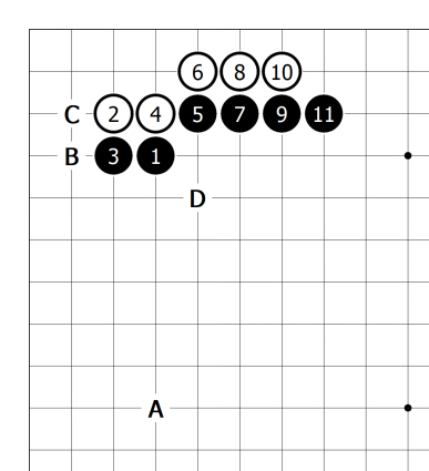 如图以后白还可以伺机在D位刺,甚至某种程度上黑这一排子还不算很厚……