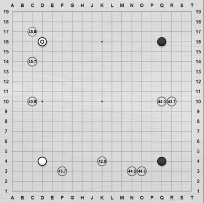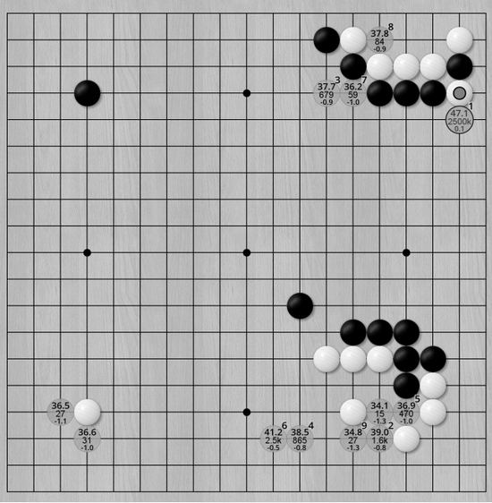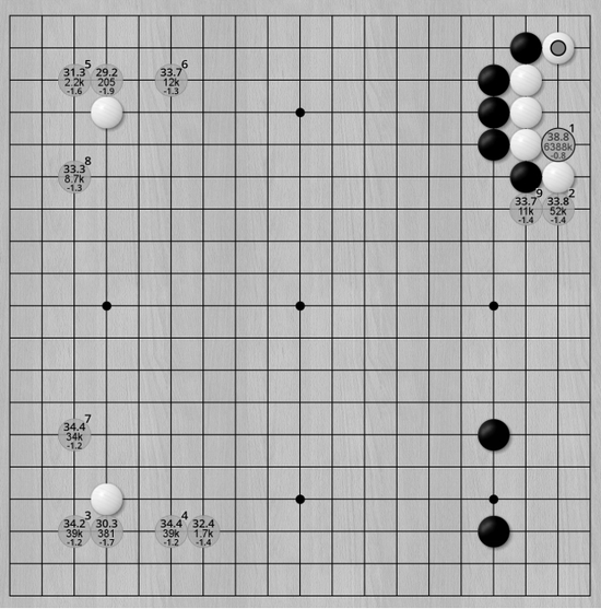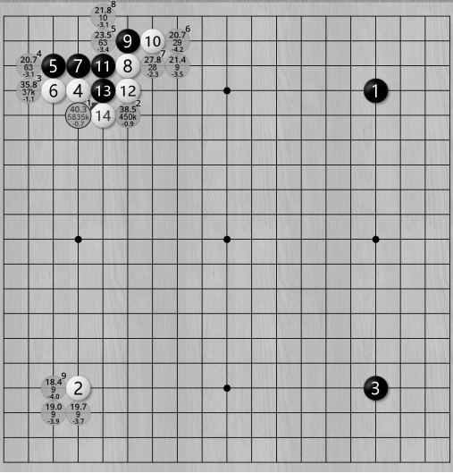 左上跟左下的棋形都很熟悉吧,这是传统的点三三定式。原来认为在星位两边开拆的情况下才会去点三三,直接走成如图的局面黑肯定大亏。在AI的分析下黑确实亏损(黑初始胜率38。5%,而现在是38.2%,胜率下降了),但亏得很微弱。
