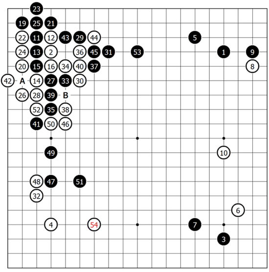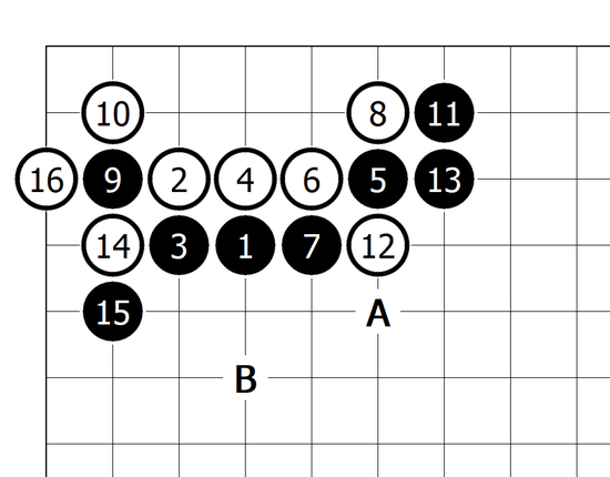 如图变化因在柯洁与AlphaGo三番棋第一局中下出而“红极一时”。黑9扳后再连扳是连贯手法,如图黑下一步如征子有利在A位征吃,如征子不利一般在B位跳。