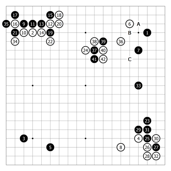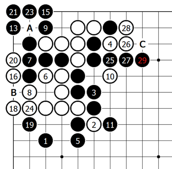 黑实战25点三三略有疑问,右边双方都还比较薄,在A位大飞,白B位压出,黑C位退,继续对白施加压力(顺便走厚自身)更为重要。